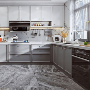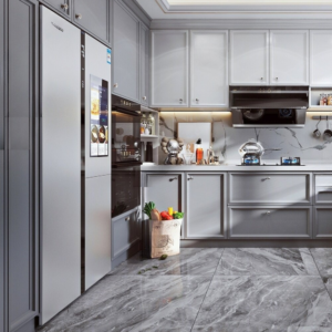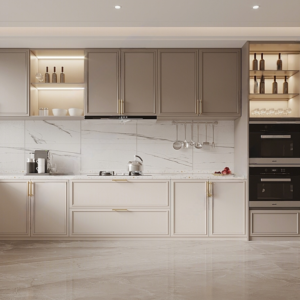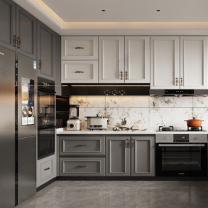 European cabinet design gives a high-end atmosphere, spacious and transparent feeling, at the same time this design is also equipped with a sense of fashion and functionality, grey cabinets to meet the colourful you!