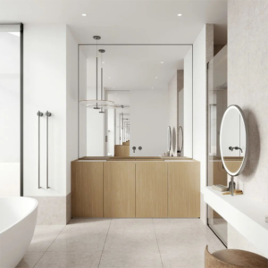 A floor-mounted vanity is a type of bathroom vanity that is supported by the floor, standing directly on the bathroom floor rather than being hung or mounted on the wall. This traditional style of vanity comes in various designs, sizes, and finishes, providing a classic and sturdy option for bathroom storage and style.