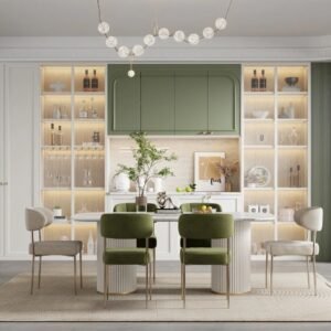 The French wine cabinet is designed with simplicity and elegance as the overall design, and the representative elements of French style, Roman decorative lines and columns, are interspersed at the top and the junction on both sides of the cabinet. The design of the lower part of the French wine cabinet is different from the minimalist design of the Chinese wine cabinet. The wooden cover door designed in French style is complex and stacked as design elements, which can highlight the overall three-dimensional and layered sense. The entire French wine cabinet exudes an elegant temperament.