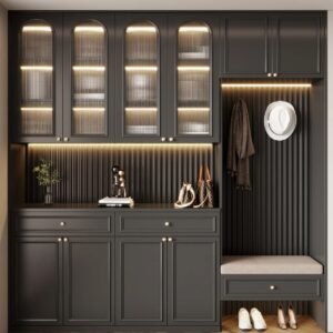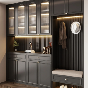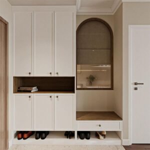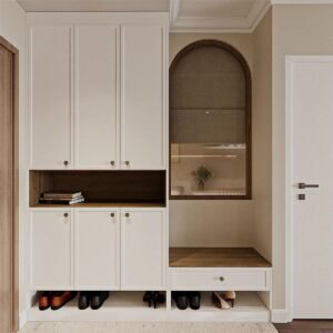 A shoe cabinet (or shoe storage) typically belongs to the category of hallway or entryway furniture, as it is designed to store and organize shoes near the entrance of a home. Shoe cabinets are specifically crafted to address the need for a dedicated storage solution for footwear, promoting an organized and tidy entry space.