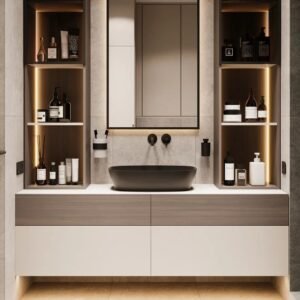 A wall-mounted vanity, also known as a wall-hung vanity or floating vanity, is a bathroom vanity that is attached directly to the wall, providing a modern and space-saving design. This type of vanity is popular for its sleek and contemporary look, and it’s often chosen to create a visually open and airy bathroom environment.