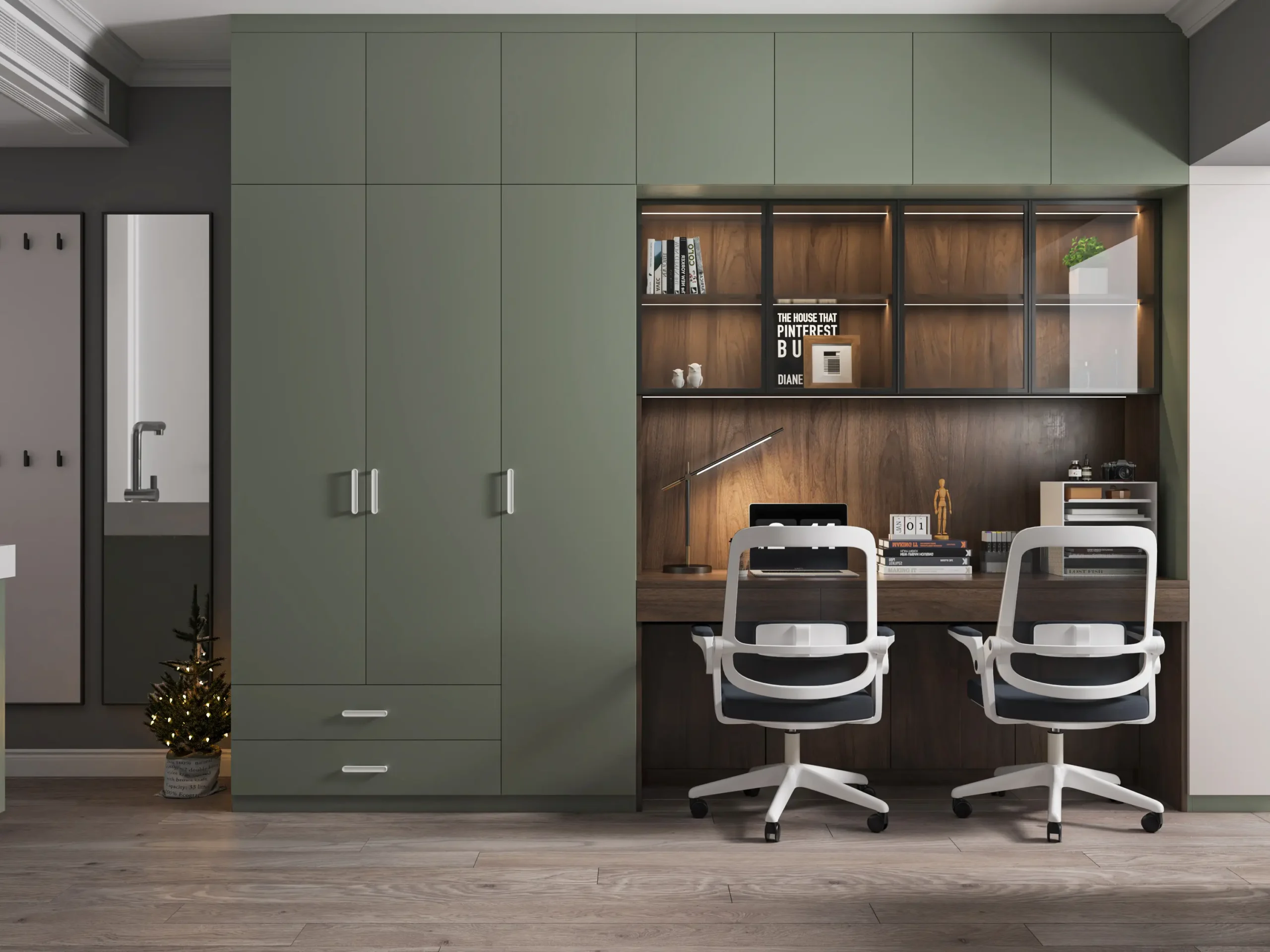 The three-door wardrobe + seven rows of wall cabinets meet the storage needs of a family; the theme colors of the entire room are matcha green and walnut, creating a warm and comfortable atmosphere.
